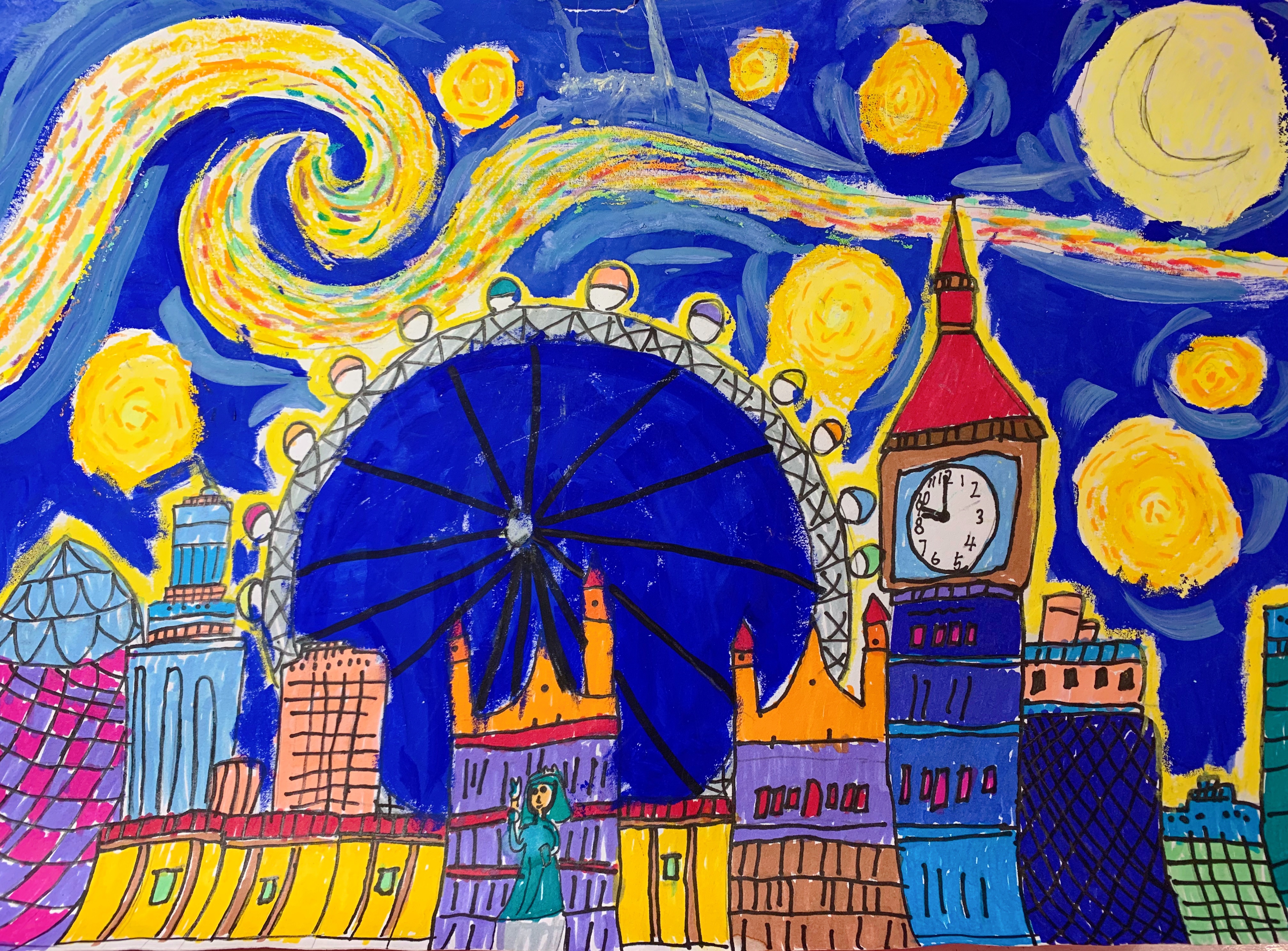 寓意:此畫是小作者根據(jù)梵高的《星月夜》所創(chuàng)。小作者通過《星月夜》得到靈感,用了漸變藍(lán)色系的月光色和彩虹般絢爛的煙花,明亮的月光,還有照耀世界的自由女神像,明亮又充滿人間煙火氣的溫暖的樓宇和房屋,還有小作者喜歡的彩色摩天輪勾畫了屬于她心中美好的《城市月夜》。雖然不同的人面對梵高的《星月夜》這幅曠世之作會有不同的理解,雖然誰也無法弄清楚梵高真正的創(chuàng)作意圖,但是他帶給我們對繪畫表現(xiàn)手法的探索與執(zhí)著,給予了我們無限的思索和啟迪。