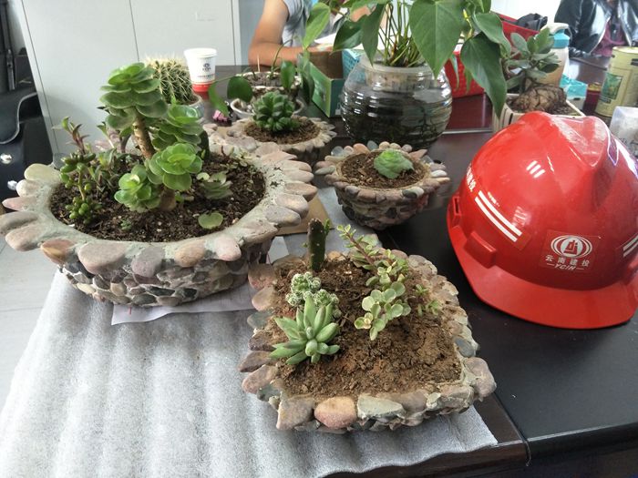 技術(shù)支持: 方森科技 今天晚飯時(shí)經(jīng)過(guò)材料室,無(wú)意間發(fā)現(xiàn)袁老師傅和小尤拿著一桶小石子和小半袋水泥在那搗鼓著什么,仔細(xì)一看,眼前的一幕讓我眼前一亮,只見(jiàn)他們一人拿著小鏟子兌著水?dāng)嚢杷?,一人在塑料盒周?chē)鷶[上小石子,不一會(huì)兒的功夫,一個(gè)個(gè)漂亮的小花盆閃亮登場(chǎng)啦。別說(shuō),這用塑料盒、水泥和小石子做出來(lái)的花盆還真是漂亮,再放上泥土,種上多肉植物,擺放在辦公桌上,真是這繁忙的項(xiàng)目駐地處里的“一股清流”啊。細(xì)問(wèn)才知道,原來(lái),這些漂亮花盆的材料都是“原生態(tài)”來(lái)的,塑料盒是吃完洗干凈的塑料飯盒,水泥是他們?cè)谒嘬?chē)卸貨的時(shí)候掃下來(lái)的水泥渣,就連小石子也都是從澄江邊上撿回來(lái)的。利用這些材料,袁老師傅和小尤親手“打造”出了辦公室里的一道靚麗的風(fēng)景。