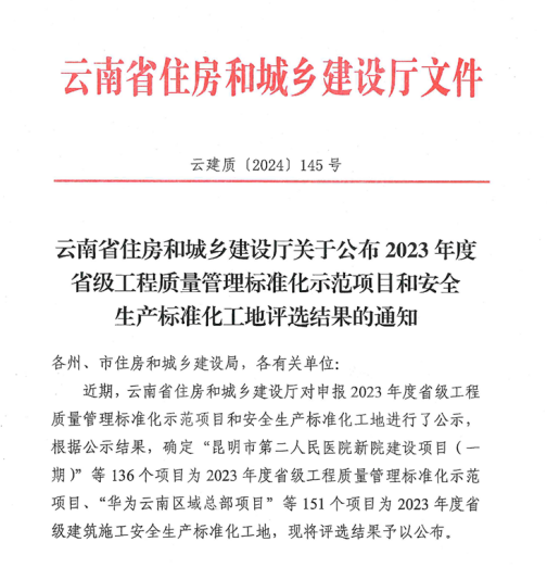 近日,云南省住房和城鄉(xiāng)建設(shè)廳揭曉了“2023年度省級工程質(zhì)量管理標準化示范項目和安全生產(chǎn)標準化工地”的評選結(jié)果,由公司第七直管項目部負責施工的云南藝術(shù)學(xué)院二期工程藝術(shù)實踐中心(含1#、2#、3#及5#、6#教學(xué)樓建設(shè)項目)、五〇八直管項目部負責施工的云南省婦女兒童發(fā)展中心建設(shè)項目及第二直管項目部負責施工的個舊市工人療養(yǎng)院提升改造項目榮獲2023年度省級安全質(zhì)量“雙標化”示范項目殊榮。