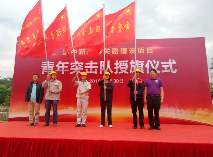 滇中新區(qū)哨關(guān)路建設(shè)項(xiàng)目共計(jì)8支青年突擊隊(duì),由各個(gè)參建單位分別組建而成,路橋總承包部黨總支書記李家舜、集團(tuán)團(tuán)委副書記楊瑜、滇中新區(qū)哨關(guān)路建設(shè)指揮部副指揮長閉春華和哨關(guān)路投資建設(shè)有限公司工程部部長程剛為青年突擊隊(duì)授旗。公司“金鷹青年突擊隊(duì)”由公司路橋一部項(xiàng)目經(jīng)理王孝生擔(dān)任隊(duì)長,項(xiàng)目部35歲以下青年職工共計(jì)17人組成。根據(jù)青年突擊隊(duì)競賽考核書,本次青年突擊隊(duì)競賽活動(dòng)從2016年6月1日至2016年12月31日止,以“安全、質(zhì)量、進(jìn)度、創(chuàng)新、技能和形象”為主題開展。