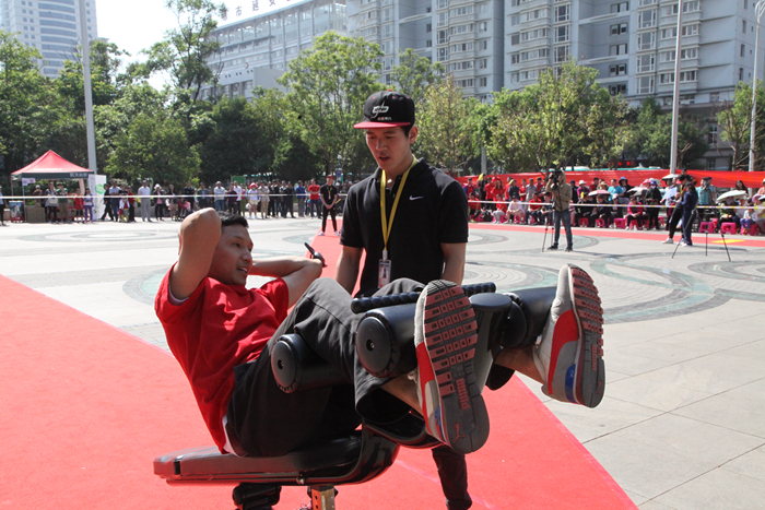 “加油!加油!”伴隨著一陣陣歡呼雀躍聲,昆明市工人文化宮廣場上正在激烈地進行一場全民健身運動會,在場的運動員們整裝待發(fā),他們或3人一組配合沖關(guān)或1人一組“獨創(chuàng)龍?zhí)丁?,待裁判一聲令下便開啟酷跑大沖關(guān)的模式。