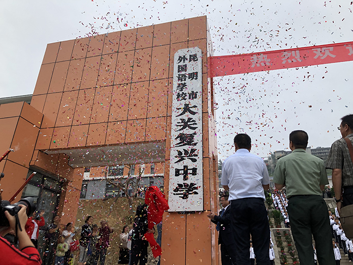 昆明市外國(guó)語(yǔ)學(xué)校(大關(guān)復(fù)興中學(xué))揭牌儀式在莊嚴(yán)肅穆大門隆重舉行,干凈平坦的道路、寬敞明亮的教學(xué)樓、整潔有序的宿舍樓、溫馨的教師周轉(zhuǎn)房以及飯菜飄香的食堂一一呈現(xiàn)在大關(guān)全體人民的眼中。
