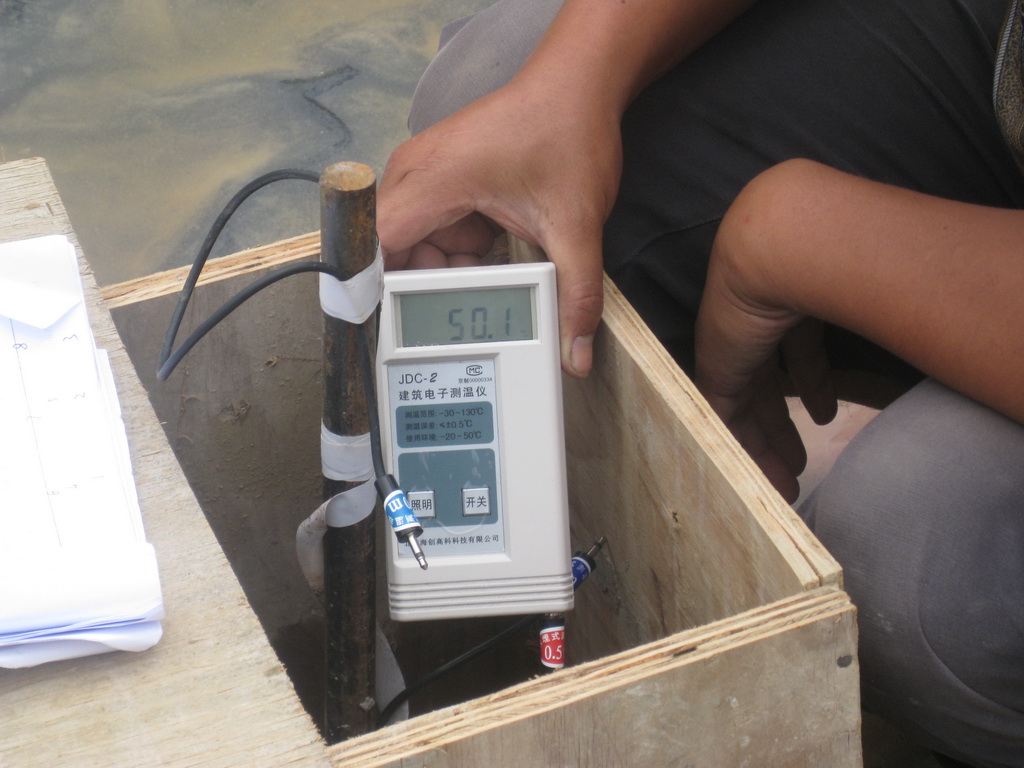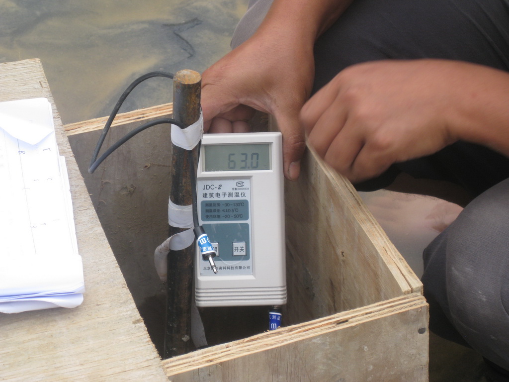 根據(jù)我公司大體積混凝土施工的成功經(jīng)驗,在澆灌混凝土之前編制了基礎(chǔ)大體積混凝土施工方案,采取優(yōu)化配合比設(shè)計、設(shè)置澆筑分倉縫,合理確定澆灌順序,保證筏板不出現(xiàn)冷縫,采用蓄水保溫養(yǎng)護法,并根據(jù)規(guī)范要求布置了7個測溫點。