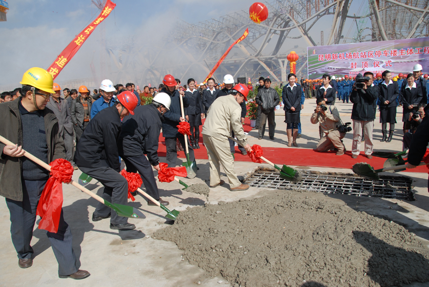 省政府副秘書長、昆明新機(jī)場建設(shè)指揮部指揮長吳凡宣布停車樓主體工程封頂,并率領(lǐng)建設(shè)、施工、設(shè)計(jì)、監(jiān)理、質(zhì)監(jiān)等各方領(lǐng)導(dǎo)鏟混凝土為停車樓封頂。