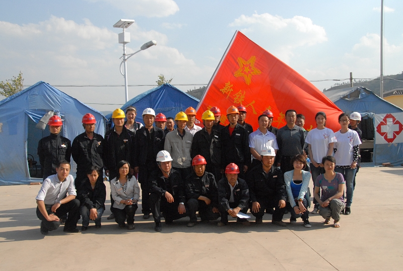 這天下午,集團(tuán)公司團(tuán)委副書記雷棲來到項目部,為項目部進(jìn)行了新鐵人青年突擊隊的授旗儀式,授旗現(xiàn)場的對面,是災(zāi)民暫時用來避難的藍(lán)色帳篷,帳篷邊的空地上停著一輛水車,上面寫著“抗旱供水”。到項目駐點的安全生產(chǎn)部副部長楊春華說:“最近氣候干旱,水車是來應(yīng)急的。”