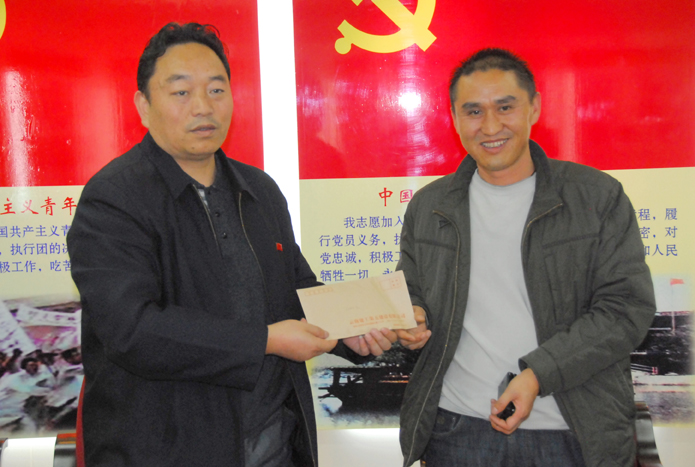 魏華(右)代表公司接受學(xué)校贈(zèng)送的錦旗