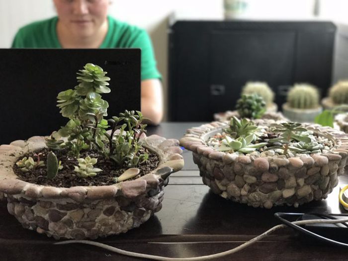 技術(shù)支持: 方森科技 今天晚飯時(shí)經(jīng)過(guò)材料室,無(wú)意間發(fā)現(xiàn)袁老師傅和小尤拿著一桶小石子和小半袋水泥在那搗鼓著什么,仔細(xì)一看,眼前的一幕讓我眼前一亮,只見(jiàn)他們一人拿著小鏟子兌著水?dāng)嚢杷?,一人在塑料盒周?chē)鷶[上小石子,不一會(huì)兒的功夫,一個(gè)個(gè)漂亮的小花盆閃亮登場(chǎng)啦。別說(shuō),這用塑料盒、水泥和小石子做出來(lái)的花盆還真是漂亮,再放上泥土,種上多肉植物,擺放在辦公桌上,真是這繁忙的項(xiàng)目駐地處里的“一股清流”啊。細(xì)問(wèn)才知道,原來(lái),這些漂亮花盆的材料都是“原生態(tài)”來(lái)的,塑料盒是吃完洗干凈的塑料飯盒,水泥是他們?cè)谒嘬?chē)卸貨的時(shí)候掃下來(lái)的水泥渣,就連小石子也都是從澄江邊上撿回來(lái)的。利用這些材料,袁老師傅和小尤親手“打造”出了辦公室里的一道靚麗的風(fēng)景。