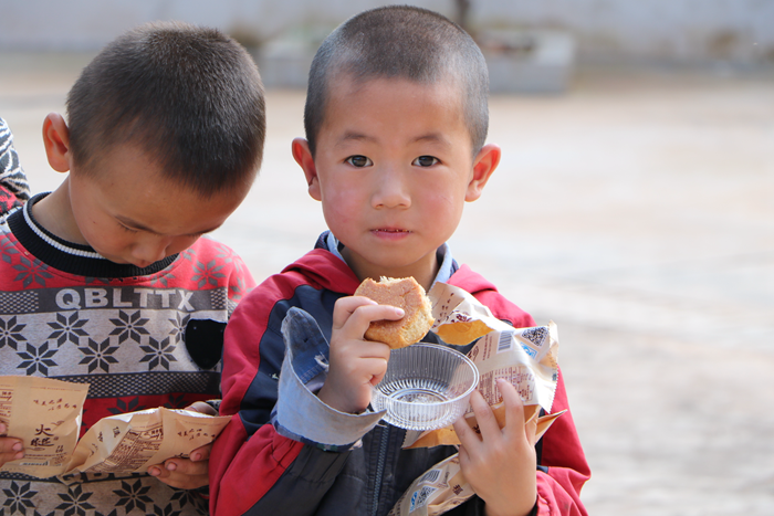 當(dāng)我們把月餅送到孩子們手中時,有的孩子忍不住現(xiàn)場品嘗起美味的月餅來,有的孩子則拿著月餅左瞧瞧、右看看,舍不得吃掉。“小朋友,你怎么不吃呢?”“我要給我妹妹帶回去,媽媽生病了,爸爸在外打工掙錢,我們家沒買過這種粑粑吃?!毙∧泻⒚鎸ξ覀円稽c(diǎn)也不害羞,而是一本正經(jīng)地講述著自己不吃月餅的“小秘密”。