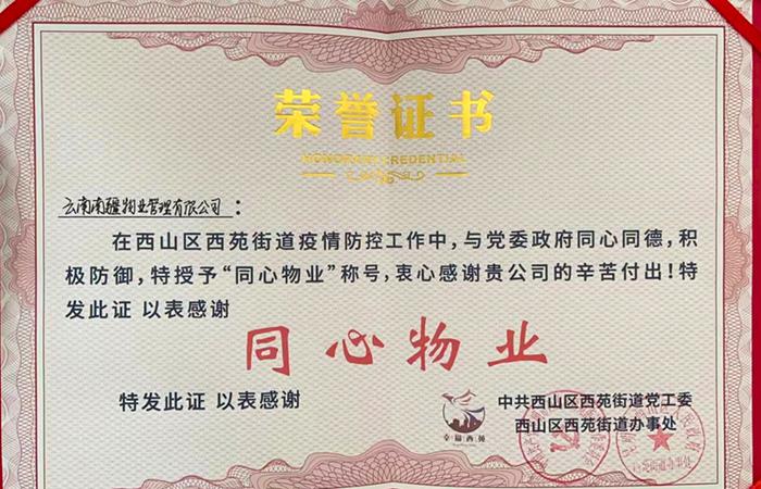 近日,公司南疆物業(yè)收到昆明市西山區(qū)西苑街道辦事處寄來(lái)的感謝信。西苑街道辦事處對(duì)南疆物業(yè)公司積極響應(yīng)號(hào)召、義無(wú)反顧參加社區(qū)疫情防控工作致以崇高的敬意和衷心的感謝,并授予“同心物業(yè)”稱(chēng)號(hào)。