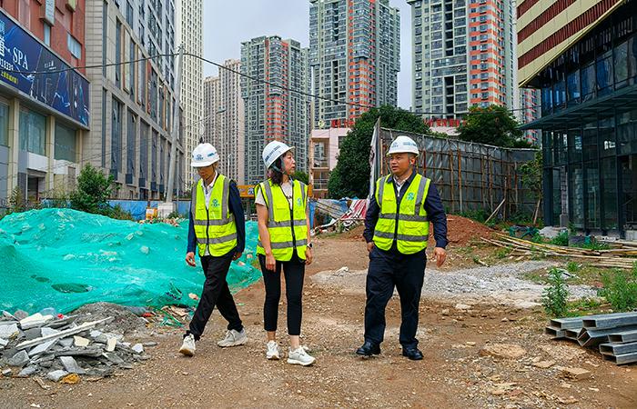 楊潔深入現(xiàn)場,詳細了解室外工程、外立面幕墻工程、室內二次結構、防火門、公共區(qū)域裝修等剩余工程開展情況,并結合項目實際情況提出指導意見。