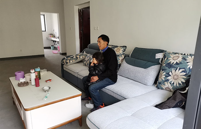韓大爺與孫女在新家看電視