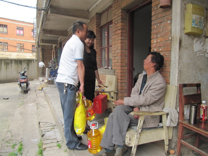 首先慰問(wèn)的是直管部退休老職工李學(xué)智,今年73歲,一直單身,膝下無(wú)子女,獨(dú)自生活在宿舍區(qū),一直以來(lái)直管部領(lǐng)導(dǎo)都特別關(guān)心他的生活起居,除節(jié)假日以外都會(huì)抽時(shí)間去看望他,我們?nèi)サ剿視r(shí),他剛好午睡完,看見(jiàn)我手里拿著相機(jī),他沒(méi)接我們遞給他的慰問(wèn)品,反而一本正經(jīng)地跟我說(shuō):“等一下,我穿好衣服戴上帽子再照可以嗎?”說(shuō)著急急忙忙去穿外衣,帶上帽子才來(lái)接收,我們幾個(gè)都被他逗樂(lè)了,在帶給他領(lǐng)導(dǎo)的問(wèn)候和了解了他最近的生活和身體情況后,他說(shuō):“真的很感謝啊……”之后的話語(yǔ)由于方言和語(yǔ)速?zèng)]聽(tīng)太清,但是我發(fā)現(xiàn)他的眼眶噙滿了淚水。其實(shí)我們很清楚老人為什么會(huì)這樣的舉動(dòng),今年7月14日凌晨2點(diǎn),老人疼痛難耐,被直管部保安發(fā)現(xiàn),負(fù)責(zé)保衛(wèi)后勤的李本紅及時(shí)將老人送到西山區(qū)第一人民醫(yī)院,經(jīng)診斷老人患了急性胃穿孔,連夜手術(shù)保住了性命,手術(shù)全程以及之后的所有住院手續(xù)都是直管部負(fù)責(zé)陪護(hù)和辦理。