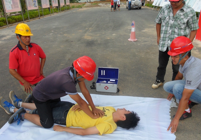 在安全管理員的指揮下,參演人員被分為3個組,每組4名成員進行安全演練。下午兩點多,隨著“受傷人員”被擔(dān)架抬出,救援演練正式開始?!皞麊T”平躺于急救擔(dān)架上,每組人員分別演練了嘴鼻放氣、口對口人工呼吸和心臟擠壓等急救方法。在演練的過程中,大家邊操作邊講述急救要領(lǐng),理論和實際操作相結(jié)合起來,收到了良好的效果。