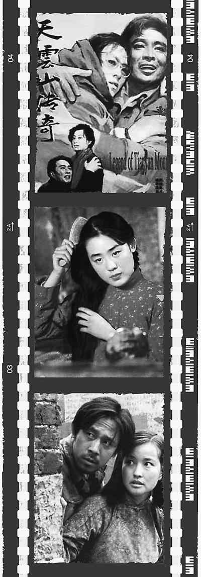 圖從上到下依次為《天云山傳奇》、《牧馬人》、《芙蓉鎮(zhèn)》的電影劇照或電影海報。 |
