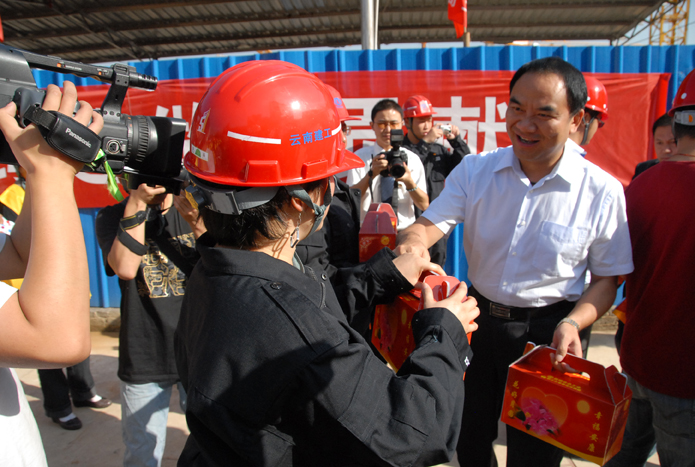 技術(shù)支持: 方森科技 2010年9月19日上午,在中秋節(jié)、國慶節(jié)來臨之際,昆明市總工會主席戚永宏率市總工會領(lǐng)導(dǎo)班子一行來到公司直五部施工的昆明市新工人文化宮建設(shè)工地慰問正在施工的公司職工和農(nóng)民工,為他們每人帶去了一盒月餅。戚永宏說:“大家辛苦了,祝大家節(jié)日快樂?!?BR> 五公司副總經(jīng)理李興奎代表施工單位對他們的到來和關(guān)心表示歡迎和感謝。他說:“多年來,公司創(chuàng)造了5項(xiàng)魯班獎(jiǎng),承建了省內(nèi)多項(xiàng)重點(diǎn)工程、市內(nèi)多項(xiàng)地標(biāo)性建筑。去年,公司簽訂工程合同額30億元,完成施工產(chǎn)值18億元,是各位領(lǐng)導(dǎo)關(guān)心、支持的結(jié)果。按建工集團(tuán)要求,今年公司承接任務(wù)要達(dá)到35億元,完成施工產(chǎn)值25億元,公司將不斷強(qiáng)化質(zhì)量、安全、文明施工管理,參與昆明市“四創(chuàng)兩爭”活動,支持新昆明的建設(shè),為昆明市的經(jīng)濟(jì)發(fā)展作出應(yīng)有的貢獻(xiàn)?!睂τ诶ッ魇行鹿と宋幕瘜m項(xiàng)目,他強(qiáng)調(diào)“公司將與設(shè)計(jì)、監(jiān)理各單位密切配合,盡快掀起施工熱潮,嚴(yán)格管理,精心施工,重合同,講誠信,按期完成施工任務(wù)?!?BR> 戚永宏一行還到施工現(xiàn)場了解項(xiàng)目的具體施工情況,與項(xiàng)目建設(shè)者們親切交談。