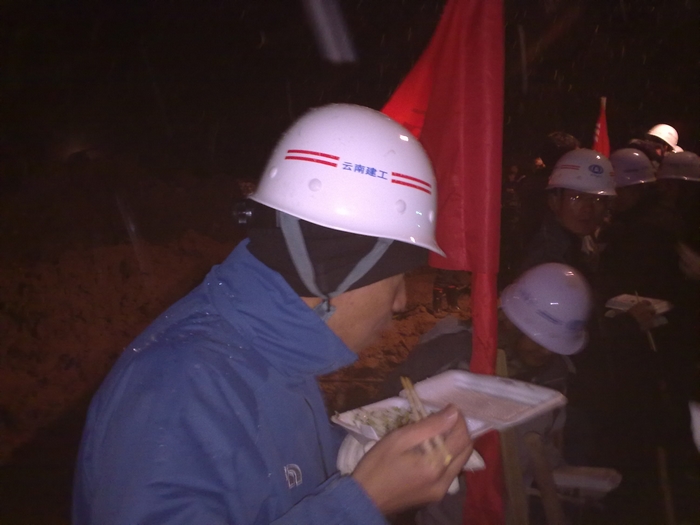 天色逐漸暗了下來(lái),氣溫也逐漸在下降,雖然參加救援的人好幾個(gè)小時(shí)沒(méi)喝一口水、沒(méi)吃一點(diǎn)東西,但仍然沒(méi)人放棄。晚上十點(diǎn),大家在奮戰(zhàn)了近十個(gè)小時(shí)后才匆匆忙忙吃了一盒盒飯。晚上十一點(diǎn),項(xiàng)目部參加救援的人員在總指揮的安排下,一部分撤離了救援現(xiàn)場(chǎng),項(xiàng)目部的趙登旭則留在了一線(xiàn)與救援人員繼續(xù)奮戰(zhàn),直至1月12日的中午。