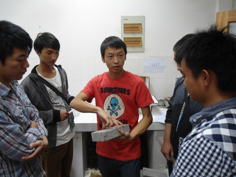 圖為試驗(yàn)計(jì)量中心工作人員為學(xué)員講解混凝土實(shí)心磚的檢測過程