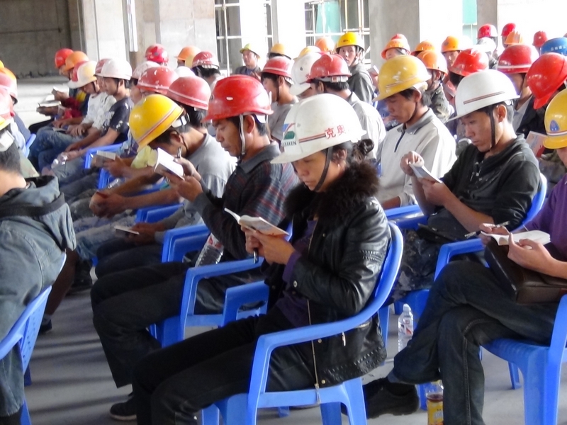“安全是自己的事,與他人無關(guān)”、“什么是安全?不發(fā)生事故就是安全”、“發(fā)生什么樣的事故與從事什么樣的職業(yè)有關(guān)”…… 2012年6月14日中午,手拿《建筑業(yè)農(nóng)民工入場安全知識必讀》的180多名操作人員和管理人員在昆一中項(xiàng)目部,與昆明市安監(jiān)站的周繼明老師一起學(xué)習(xí)了上述的安全知識。